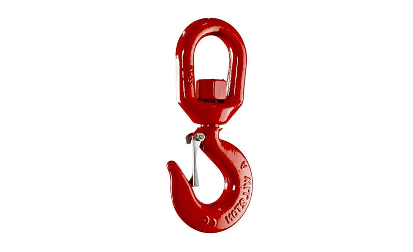 Крюк оснащен замком, который автоматически закрывается при подъеме груза. Это минимизирует риск случайного освобождения петли или стропа. Для разблокировки предусмотрен предохранительный рычаг, обеспечивающий безопасное использование.